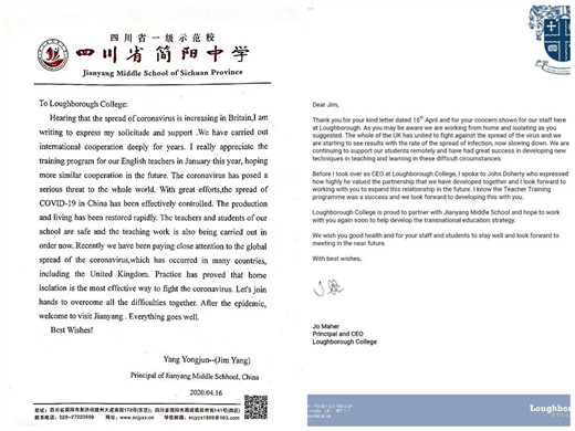 疫情期间,简阳中学给英国拉夫堡学院送去了慰问,并表达了希望在疫情后继续和友校开展国际交流活动。在收到简中的慰问后,拉夫堡学院的校长也送来了感谢信,分享了拉夫堡学院的抗疫措施,对简中的学子表达了关心。